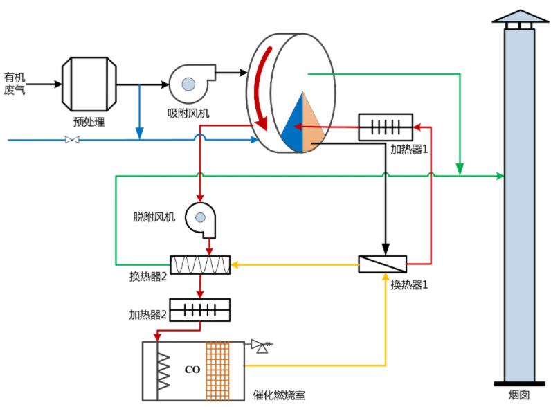 脫附再生:用少量高溫空氣(180-220℃)對吸附飽和區(qū)域進行脫附,濃縮后的高濃度廢氣(濃縮比10-25倍)進入催化燃燒單元。